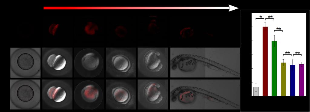 作者基于在荧光探针及激活式载体方面的研究基础,首先设计和合成了H2Sn刺激响应的聚合物胶束载体,通过信号转换设计和信号单元标记,构建了H2Sn刺激响应的荧光纳米信标。纳米信标进入胚胎细胞后,其被内源性H2Sn激活后,释放荧光染料,染料与猝灭剂脱离后荧光信号恢复,实现信号放大,且染料可与胞浆蛋白结合,进一步实现荧光信号大幅度增强,从而达到二次信号放大。聚合物纳米信标通过两次信号放大模式展现出极高的灵敏度,从而实现对胚胎发育过程中的H2Sn进行荧光成像。