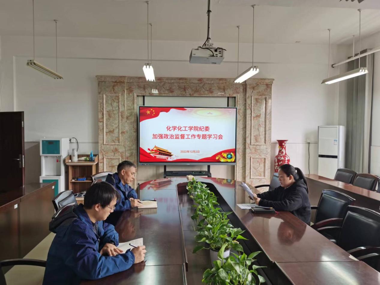 2022年12月2日,化学化工学院纪委于工三B318开展加强政治监督工作专题学习会。本次会议由纪委书记陶双主持,纪委成员张雄飞、李焰参加。