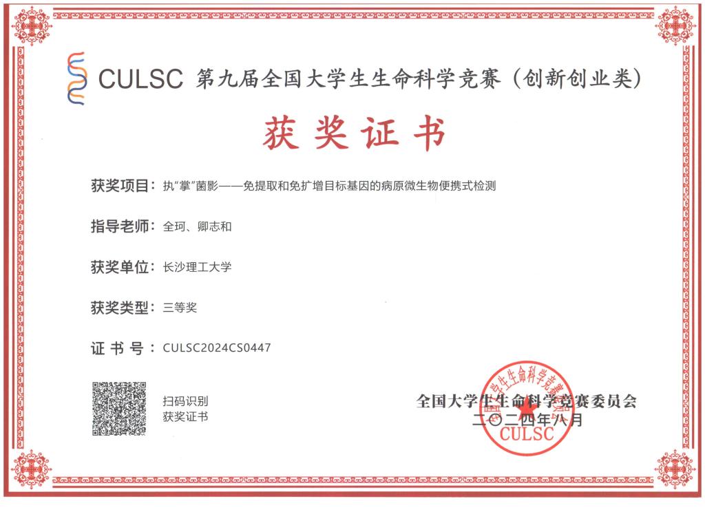 获奖等级:第十届全国大学生生命科学竞赛(创新创业类)二等奖