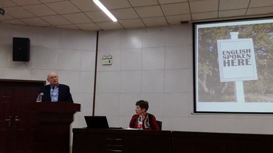 On November 25th, at the invitation of CSUST, senior linguists Milo Kaufmann and Helen Kaufmann from the United States presented the first of a series of lectures titled “World English and Issues in Translation” to the staff and students in the School of Foreign Languages.