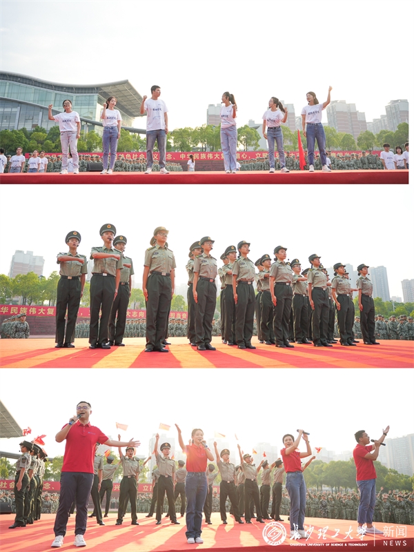 典礼开始前,民兵连同学齐唱《祖国不会忘记》,在“9·18”这个特殊的日子里,勉励同学们共同铭记历史、不忘国耻、珍爱和平、开创未来。在《红旗飘飘》慷慨的歌声中,巨幅国旗在新生队列中接力传递。新生纷纷用双手触摸国旗,感受与祖国的血脉相连,向祖国深情告白。