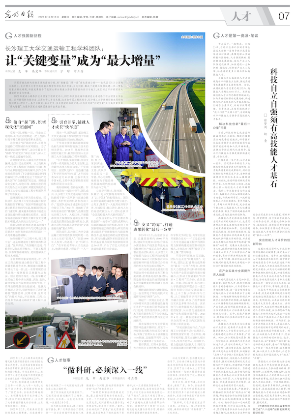 12月17日,《光明日报》人才版专版报道我校人才工作。在人才强国新征程板块刊发《太阳成集团tyc122cc入口交通运输工程学科团队:让“关键变量”成为“最大增量”》文章,在人才故事板块刊发《“做科研,必须深入一线”》文章。