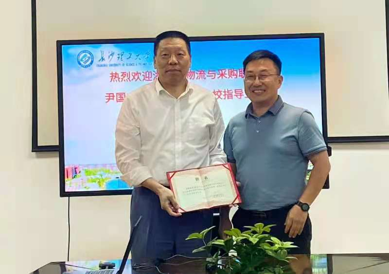 6月29日下午,湖南省物流与采购联合会尹国杰会长、副会长邓志勇及相关部门负责人等一行到我校,就全面开展产学研合作洽谈交流。学校副校长钱国平会见了尹国杰会长一行。座谈会在交通运输工程学院工科2号楼会议室举行,交通运输工程学院党委书记孔伟红、院长张军辉,副院长王煜坤、周访滨,智能交通与现代物流研究院院长卢毅,物流工程专业教师出席座谈会,座谈会由卢毅主持。