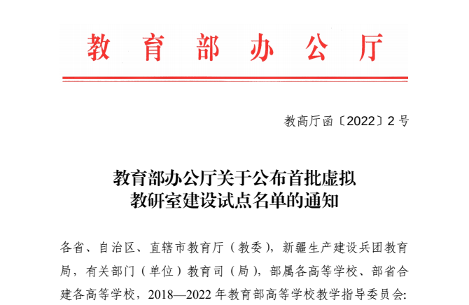 为贯彻落实“十四五”教育发展规划有关部署,加快虚拟教研室建设,经各地各高校和教育部高等学校教学指导委员会推荐、专家综合评议,教育部按相关工作程序确定了首批虚拟教研室建设试点名单。