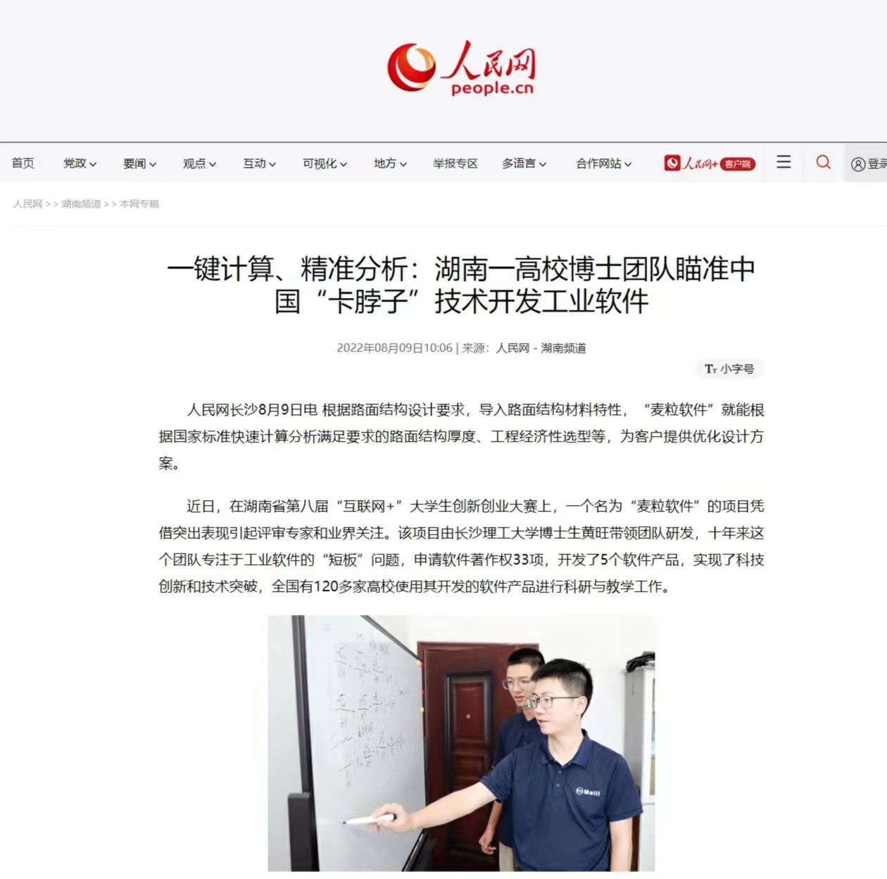 近日,我院博士研究生黄旺的创新创业事迹被人民网、光明日报、湖南日报等多家权威媒体广泛报道,“湖南一高校博士团队瞄准中国‘卡脖子’技术开发工业软件”、“这个团队,十年磨一‘件’”、“长理博士带队研发的工业软件打破国际垄断”等成为时下的教育领域新闻热点主题。报道推出后引发社会热烈反响,澎湃新闻、中国教育新闻网、腾讯网、新浪财经、今日头条、搜狐新闻、网易新闻、湖南在线、新湖南、华声在线、湖南教育新闻网等省内外媒体纷纷转发,全网阅读量超千万,不少网友为我校研究生勇于创新的精神纷纷点赞。