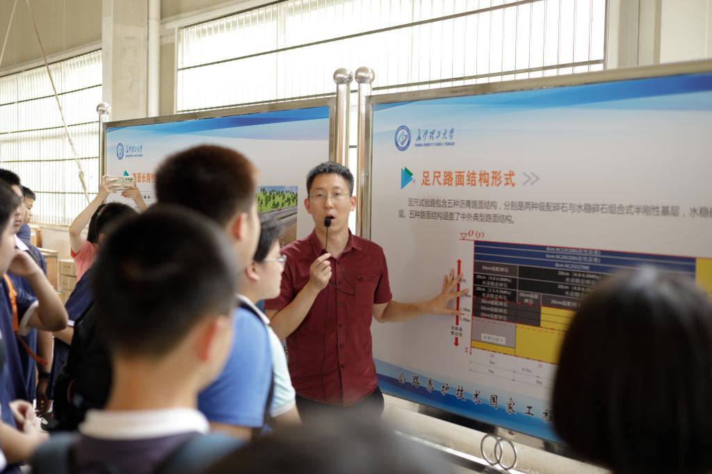 长郡双语实验中学师生十二点半抵达太阳成集团tyc122cc入口公路养护技术国家工程研究中心,在交通学院葛冬冬老师的带领下,师生参观了公路养护技术国家工程研究中心展厅、实验室高精尖设备及足尺路面加速加载实验室,同学们了解了在“交通强国”等国家战略和行业重大科技需求下,中心坚持创新、追求卓越,在特殊土路基、耐久性路面、精细化养护和路基改扩建等方面取得的系统性创新成果。从一条公路的生命历程到我国五百多万公路里程的发展史,几代筑路人不屈不挠、奋勇向前、努力拼搏的精神风貌极大地鼓舞着师生们的学习热情。实验室的原子力显微镜、电子扫描显微镜、足尺路面加速加载测试系统等设备激发着学生对科学的兴趣与向往。