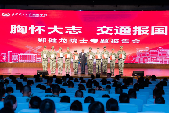报告会上,郑健龙院士为交通学院新生代表赠送了由其本人亲笔签名的书籍《两院院士忆高考》,并亲切寄语青年学生“希望你们传承校训精神,勇担时代使命,为交通强国贡献青春力量。”