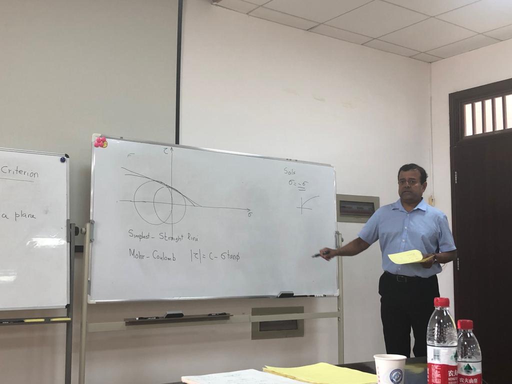 Muhunthan 的研究方向主要包括岩土力学基本理论研究、岩土材料热动力学本构方程以及理论研究、岩土材料微观结构表征以及岩土材料局部稳定性分析等,其研究成果在以上领域均有着广泛深远的科学意义和工程应用价值。本次讲座主题主要围绕道路工程弹塑性力学基础(Mechanics Foundation of Road Engineering)进行全程英语授课,地点在工二B413,授课时间从13日持续到16日。