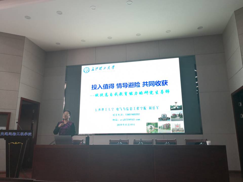 我校电气与信息工程学院周任军教授就如何提升研究生导师教育教学能力做了《投入值得,情导避险,共同收获》的专题讲座。周教授从研究生培养的成效、培养的过程、如何提升研究生科研能力以及关注个体与心理等四个方面展开论述。周教授结合自身的经历,阐述了自己对研究生培养的认识,提出研究生培养过程也是导师的成长过程,最终实现共同进步。