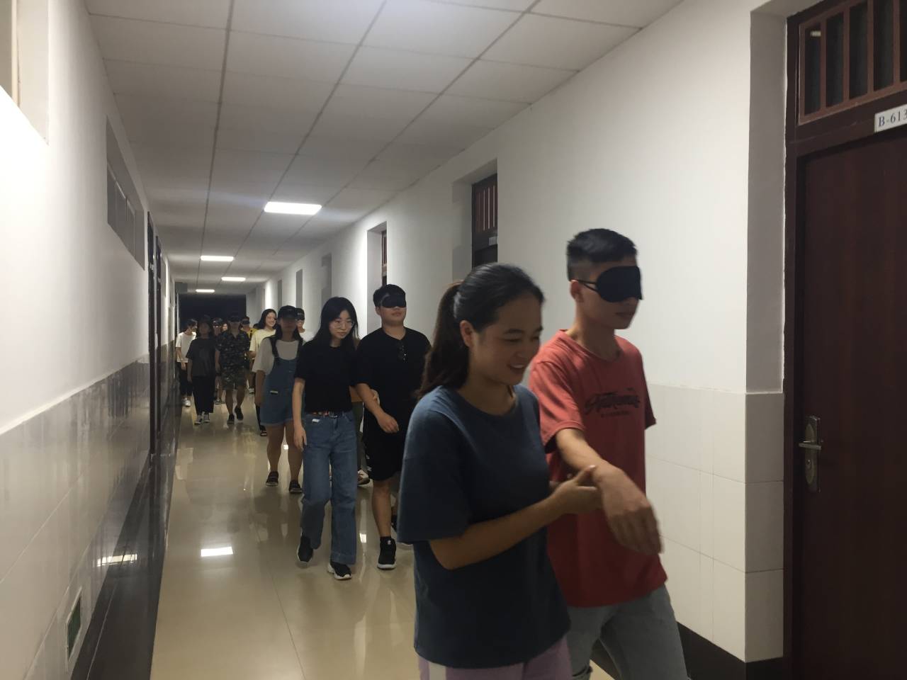活动按着大众化、趣味化原则,设置了“马兰开花”、“孤独人生”、“盲人旅行”、“走出圈外”四个环节。活动过程中,下班们相互鼓励、相互帮助、积极配合,原本较陌生的下班们,在短时间内凝成一股力,已然成为了一个整体。当“盲人旅行”环节结束时,有下班发言:当自己在黑暗中无助的时候,被别人帮助的感觉真好,要学会相信和帮助身边的人。肖敏强表示:本次培训旨在帮助下班更好开展后续工作,通过利用破冰活动,消除新生之间的隔阂,加强班级凝聚力,帮助新生更好的融入大学生活,下班在新生工作中起着重要的作用,要不断加强自身素养,做好新生思想引领工作,及时向班主任及辅导员反映学生情况,共同做好2019级学生各项日常工作。