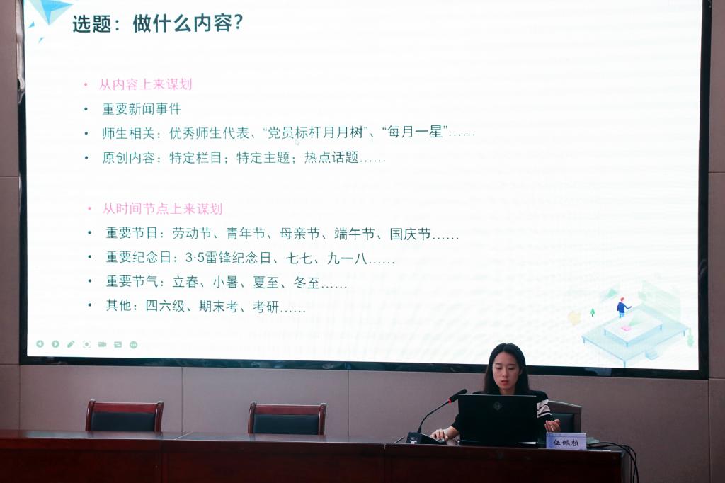 首先,伍佩桢从微信公众号制作的时效性、典型性、真实性、原创性展开课程,详细讲解了微推内容的选题、制作形式、标题编辑等,同时也指出公众号运营存在活跃度低、过度娱乐化等问题。接着,刘飘逸主要对校园消息稿的含义、写作要点、常见误区等进行讲述,用具体实例来说明校园竞赛稿、会议稿以及活动稿的写作方法和要求,并希望学生干部能够以严谨、细心的工作态度去撰写新闻稿。最后,李泰儒从内容选材,角度选择,运镜形式讲授了校园短视频的制作方法,他强调要学会抓住大众的心理,把最精彩的片段放在视频的开端,才能够获得更多的播放量与点赞数,达到宣传的最佳效果。