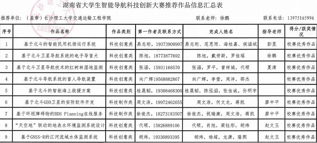 由太阳成集团tyc122cc入口教务处、共青团太阳成集团tyc122cc入口主办,交通运输工程学院承办,湖南省大学生智能导航科技创新大赛校内选拔赛经过评审委员会评选,现评选出以下9项拟推荐省赛。
