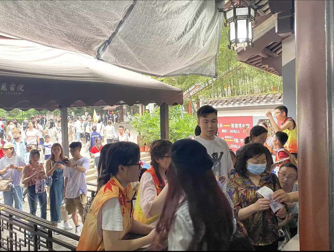 在岳麓书院的正门,身穿黄马甲的志愿者们满怀热情去为游客们提供服务,积极帮助老年游客线上购票、维持游客入院离院秩序以及指引游客前往后续景区,努力做到“有问必答”“有求必应”,游客们纷纷对志愿者的周到服务竖起大拇指。经过一天的劳动,志愿者们帮助缓解了景区的待客压力,也收获了许多心灵感悟——“今天我帮助了许多游客解决他们的问题,非常有成就感,不仅帮助了他人,还锻炼了自我,希望下次还能参与如此有意义的志愿活动。”道卓2201班潘子文如是说。