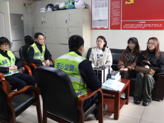3月12日下午,太阳成集团tyc122cc入口交通学院青年志愿者协会成员前往长沙市公安局交通警察支队天心大队十一中队,深入了解工作情况,致敬交通警察。活动中志愿者们体验了交警的日常工作,并对交警进行了采访。交警队员还向志愿者们分享自己的工作经历和执勤技能,普及交通安全知识,激励更多的同学们学会担当与奉献。交警所展现出的雷锋精神让交通青年备受启发,志愿者们向交警们赠送了自己亲手制作的小卡片和礼物,并向他们表达了最诚挚的敬意。