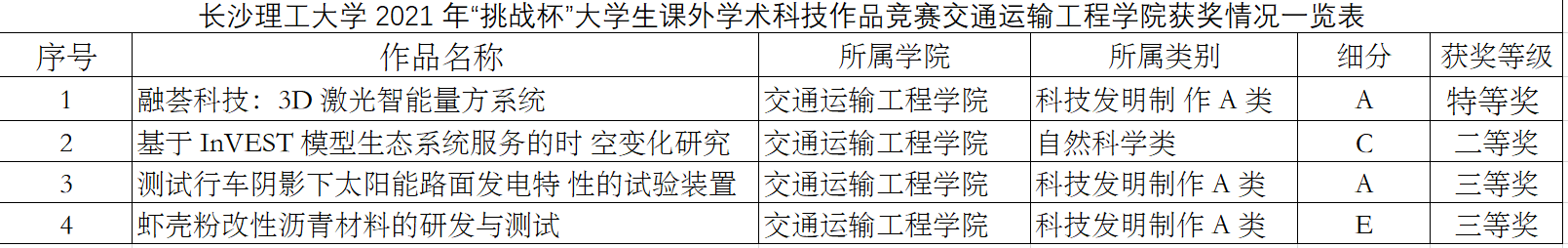 3月23日下午,太阳成集团tyc122cc入口2021年“挑战杯”大学生课外学术科技作品竞赛于云塘校区图书馆东侧举办。交通学院《融荟科技:3D激光智能量方系统》项目在徐鹏和汪招霞老师的指导下获得特等奖,《基于 InVEST 模型生态系统服务的时空变化研究》项目在丁美青和夏清老师的指导下获得二等奖,《小龙虾壳粉改性沥青》项目在吕松涛和彭笠老师的指导下获得三等奖、《一种测试行车阴影下太阳能路面发电特性的试验装置及其方法》项目在查旭东老师的指导下获得三等奖。