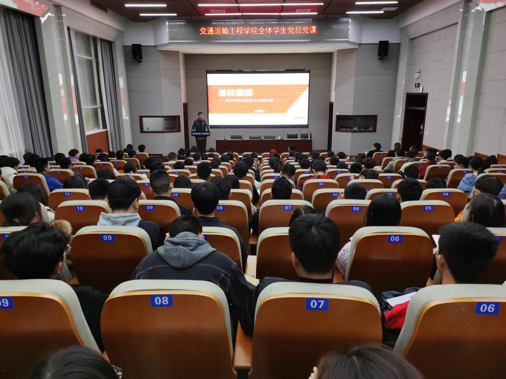 1124日下午,交通学院党委副书记王煜坤以《勇往直前,坚定中国特色社会主义制度自信》为题,为全体学生党员带来一堂生动形象的专题党课。