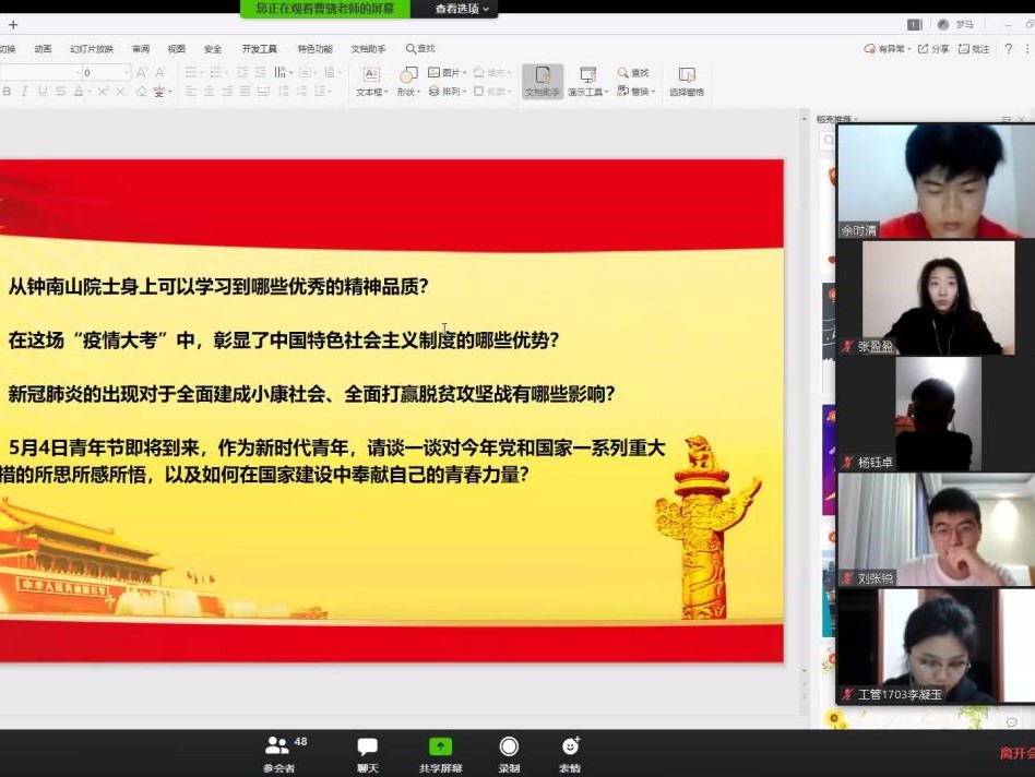 党课以观看纪录片《钟南山》为展开,各党支部书记结合中国特色社会主义制度优势进行深化授课。授课结束后,党员同志们就自身所思所想、今年的特殊形势以及我党的奋斗目标展开讨论。党员同志表示,在国内外防控疫情工作的对比之下,看到了中国特色社会主义制度的巨大力量,也看到了我党非凡的领导力与决策力,对今年如期实现“全面建成小康社会”的奋斗目标充满信心。不少同志结合自身,谈到青年就应该像习近平总书记说的那样,同人民一道拼搏、同祖国一道前进,服务人民、奉献祖国,到基层和人民中去建功立业,让青春之花绽放在祖国最需要的地方,在实现中国梦的伟大实践中书写别样精彩的人生,这才是当代中国青年的正确方向。