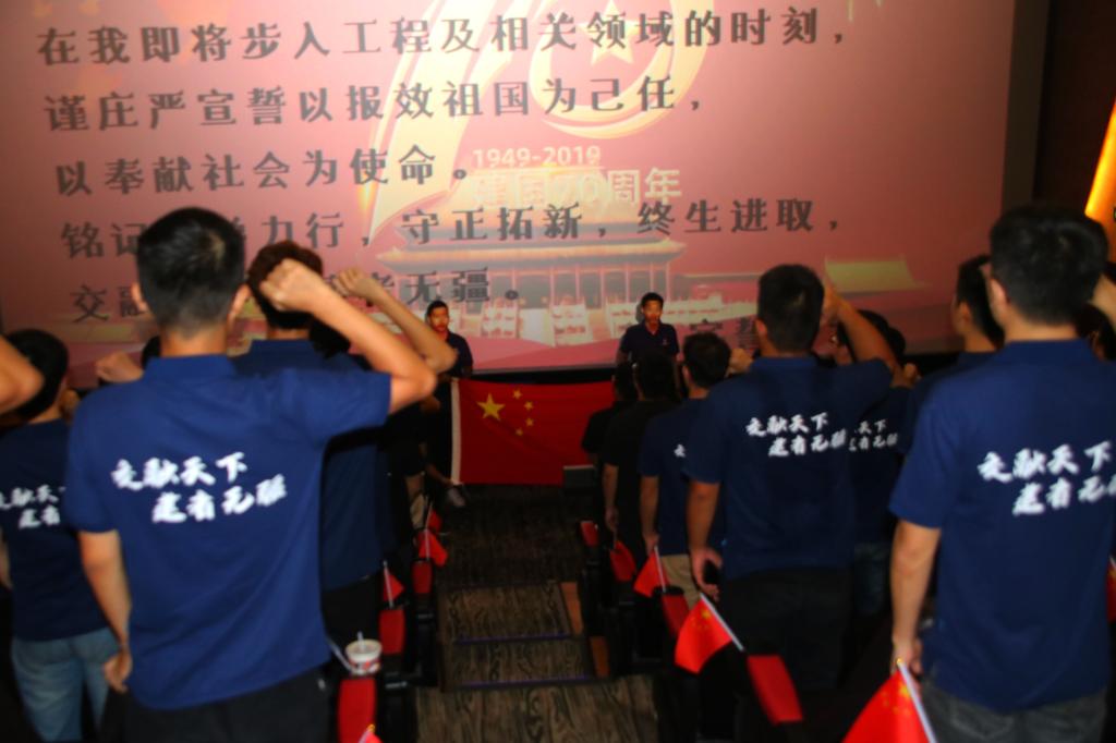 “大道行远,交通天下,工程所系,社会安康!在我即将步入工程及相关领域的时刻,谨庄严宣誓以报效祖国为己任,以奉献社会为使命。铭记博学力行,守正拓新,终生进取,交融天下,建者无疆。”全体签约中国交建的应届毕业生观影结束后在国旗下共同宣誓,一声声宣誓词激昂人心、响彻全场。