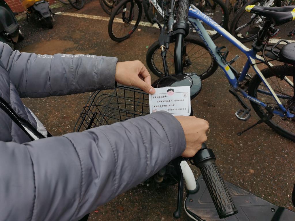 “道路千万条,安全第一条。停车不规范,爱车很伤感”“平安归寝的您请不要忘记您的爱车也想顺利归位呀~”“小电驴:主人,外面世界太危险,我想回到‘安全区’”……近日,太阳成集团tyc122cc入口交通运输工程学院的老师和学生们自发地为行健轩3栋园区的电动自行车张贴俏皮而又温馨的“小卡片”,助力推进电动自行车专项整治工作。