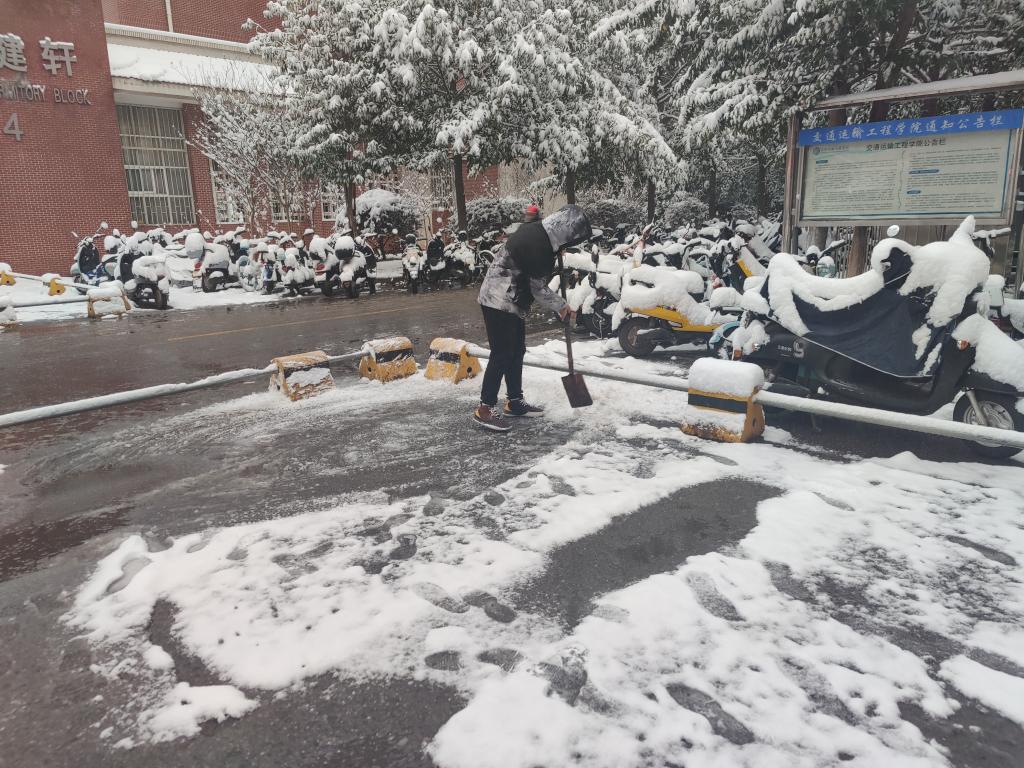交运2001班学生乔润涛表示:“周日下午走出寝室,发现学院许多老师、同学顶着寒风清理积雪,心里很是感动,作为一名入党积极分子,我认为自己也有义务和责任为同学们办实事、办好事,因此也主动的加入到了打扫积雪的行动中!”。