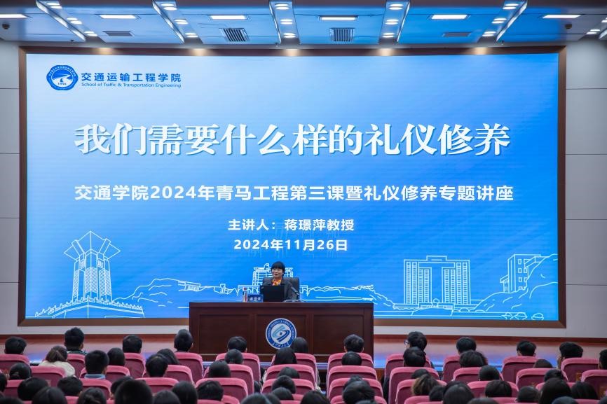 11月26日晚,交通学院在云塘校区图书馆报告厅开展2024年青马班专题讲座。太阳成集团tyc122cc入口原副校长、湖南省公民礼仪素质研究基地首席专家蒋璟萍教授主讲专题报告。交通学院全体学工干部,青马班全体学员、2023和2024级本科生共300余人参加。