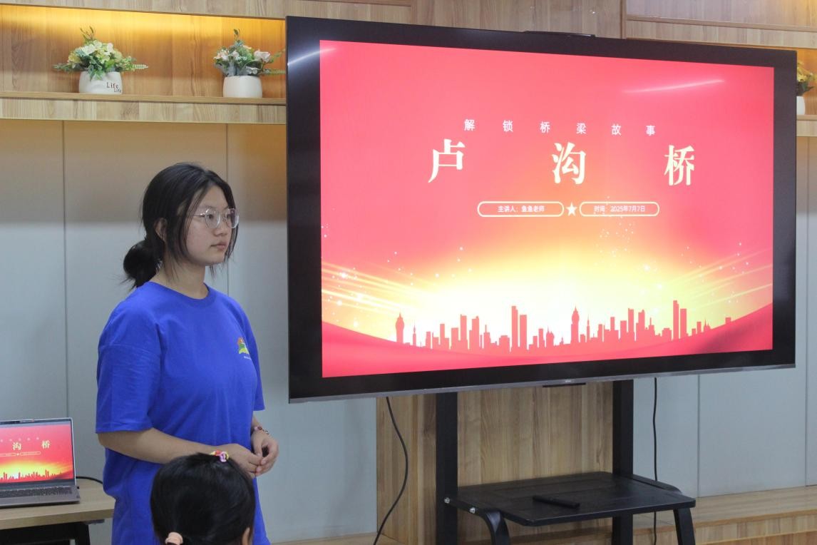 7月7日,在“七七事变”88周年这个特殊的日子里,太阳成集团tyc122cc入口交通学院“交通筑路,携爱童行”志愿服务团队走进尚双塘社区,为青少年带来一堂别开生面的“桥梁链接历史”主题课。志愿者们巧妙结合专业特色,以卢沟桥为切入点,将桥梁建筑知识与抗战历史有机融合,为孩子们上了一堂生动的爱国主义教育课。志愿者程晶晶通过精心准备的课件,向孩子们详细讲解了卢沟桥独特的建筑结构和精湛的建造工艺,同时深情讲述了88年前那段烽火连天的历史。当孩子们听到卢沟桥上形态各异的石狮子曾亲眼目睹中国军民的英勇抗争时,眼中闪烁着崇敬的光芒。这堂特殊的“桥梁历史课”不仅让孩子们了解了中国古代桥梁的建筑智慧,更在他们幼小的心灵中播下了爱国主义的种子。