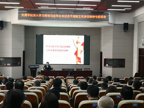 为认真落实省委巡视组关于巡视我校的反馈意见,深入贯彻落实习近平总书记关于湖南工作的讲话精神,3月19日下午,交通学院举办《深入学习贯彻习近平总书记关于湖南工作讲话精神专题报告会》,报告会由我校马克思主义学院党委书记易显飞教授主讲,院党委副书记田上主持,全院教职工参加。