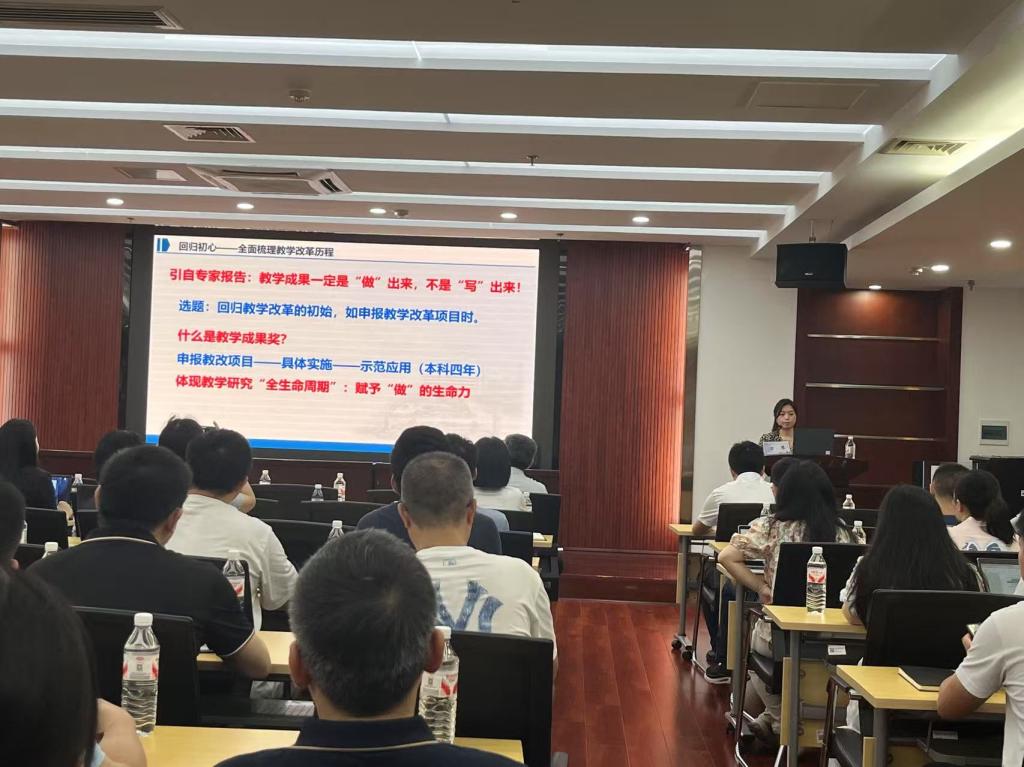 为进一步提升我校教学成果奖申报水平,推动教学成果培育工作迈上新台阶,6月27日上午,我校举办教学成果奖专题讲座。本次讲座特邀国家级教学成果奖获得者万琴教授担任主讲嘉宾。讲座由教务处副处长唐欣主持,各学院教学成果奖申报团队负责人、骨干成员等近百人参会。