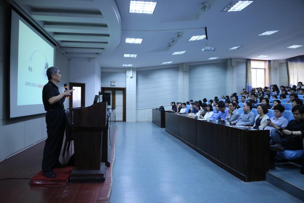 随后孟建民院士为到场的师生带来了一场学术盛宴。孟院士分别从什么是未来,未来性,未来性建筑,科技进步对建筑发展的影响等方面进行了讲述。他以动态画面的形式为现场观众展示了典型动态建筑案例和自己在动态建筑实践方面的探索,包括其设计的曾经入围上海世博会中国馆的斗笠造型动态建筑、冰晶岛、未来“超级城市”畅想等系列作品。