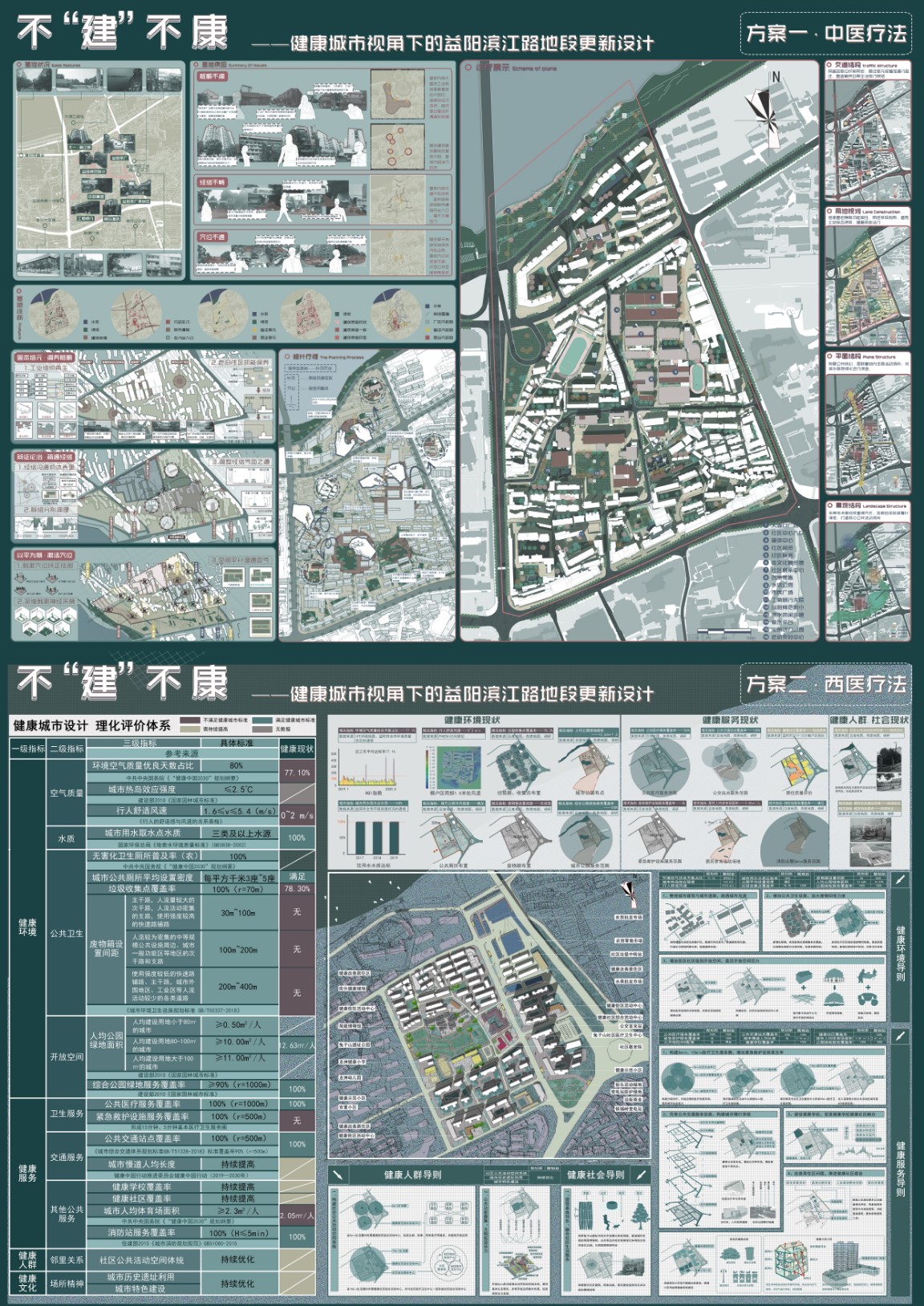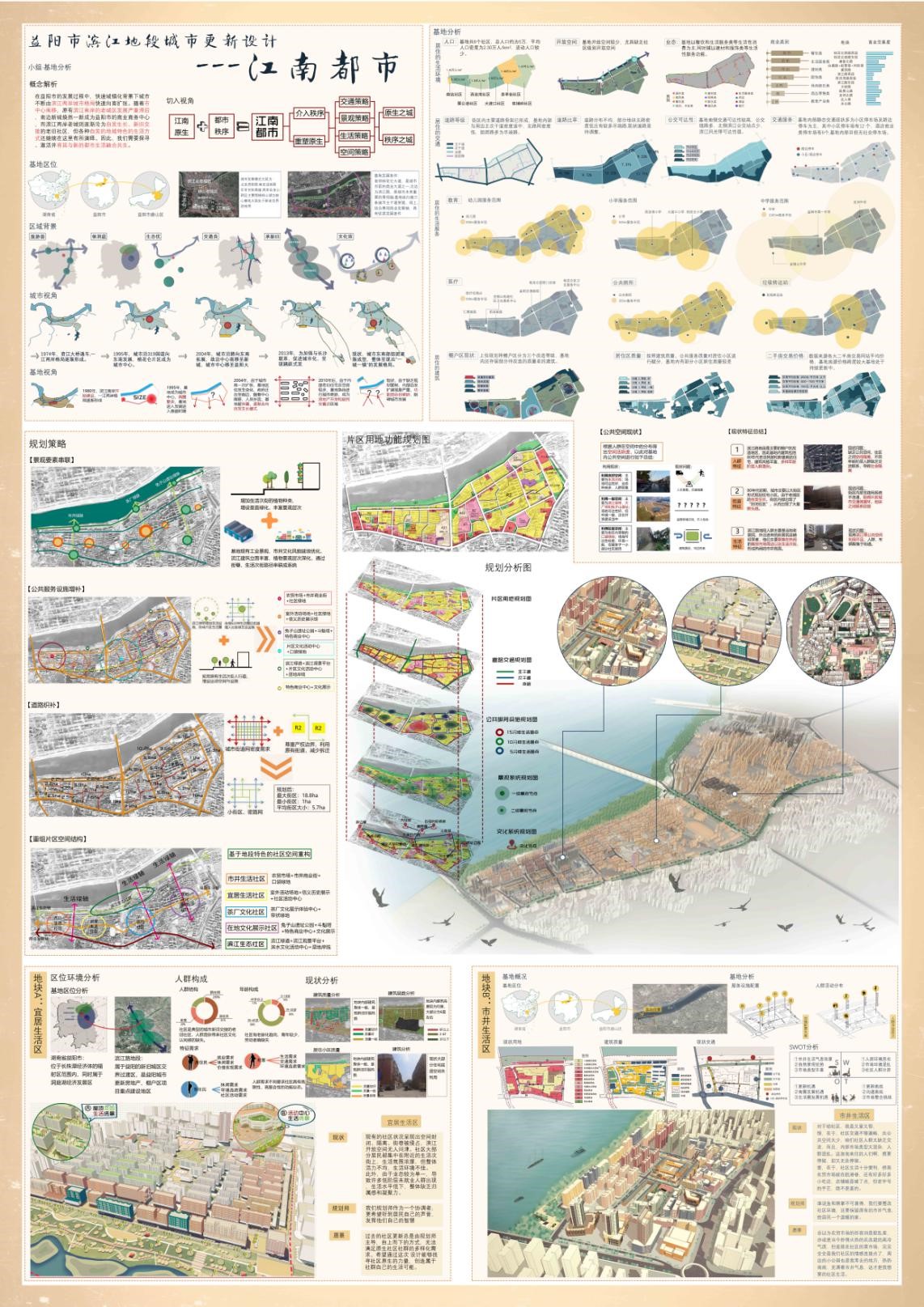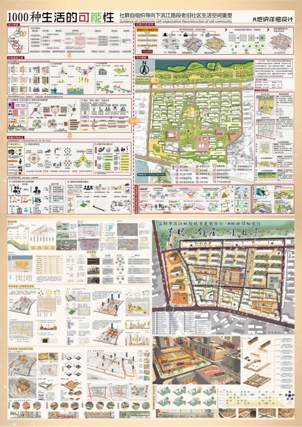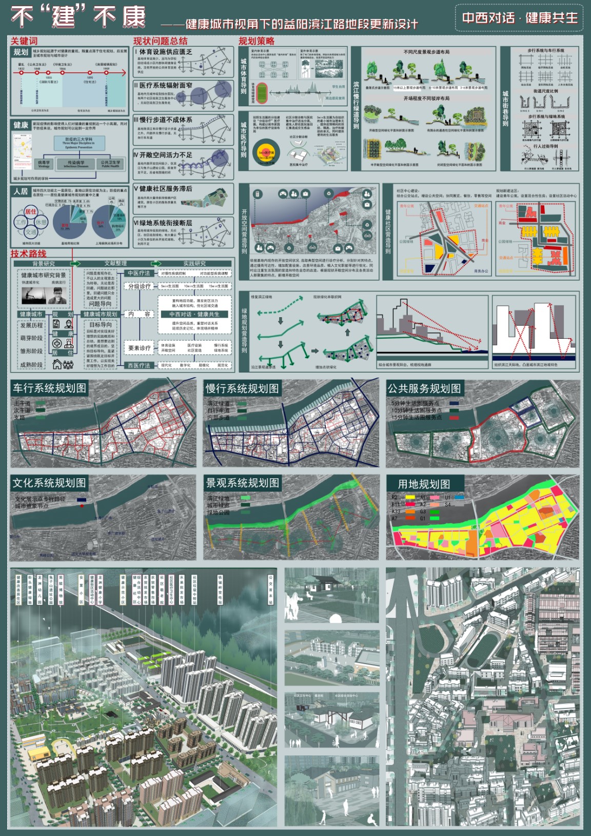 由邓斌、欧阳慧婷、黄铭东、张婷婷四位同学完成的两组方案均为益阳市滨江路地段老旧社区的更新设计。第一组方案“江南都市”提出“社群自组织”目标导向的概念,它强调社群性和自组织性,针对现状提出三大策略,一是市井重塑,二是空间交融,三是时空的共享。将基地更新改造成具有人间烟火味和市井小生活社区,以达到社会关系的共存,人群的共生以及空间的共享,最终实现“共建、共生、共享”的社区生活新模式。第二组方案“不建不康”基于中西医疗法理念,选取典型空间进行定性和定量相结合诊断分析,注重生活氛围的营造和特色业态的改造,以期获得健康的人居环境。两组方案概念新颖独特,得到专家一致好评。经过一天的方案展示、学生汇报、专家评审等环节,最终分别取得一等奖和三等奖的好成绩。本次竞赛成绩反映了我院城乡规划专业的办学实力,也凸显了我校学生的专业素养。我系将再接再厉,为社会培养高素质的人才,为国家城乡建设做出应有的贡献。
