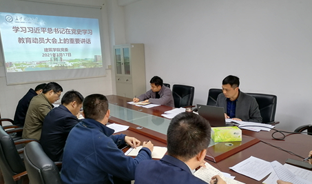 学习会上,建筑学院党委理论学习中心组成员围绕习近平总书记在党史学习教育动员大会上的重要讲话精神、中共中央印发《关于在全党开展党史学习教育的通知》文件精神,学校党委书记付宏渊在我校党史学习教育启动仪式上的讲话开展交流学习。