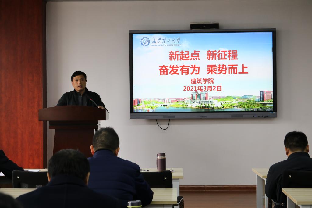 邱国良作了题为:“新起点、新征程、奋发有为,乘势而上”的动员发言,他首先肯定了全院教职员工过去一年的工作,尤其是突破重重困难,学院建筑学专业成功入选“国家级一流专业建设点”,不容易,这是大家共同努力的结果,可喜可贺。他对2021年工作提出要求:要积极贯彻“三高四新”的战略方针,引领学院发展;加强理论学习,积极参加党史学习教育,淬炼师德师风;做实专业建设,积极备战冲刺五月份的建筑学专业评估;强化学科建设,服务乡村振兴;加内部治理,服务学生发展。