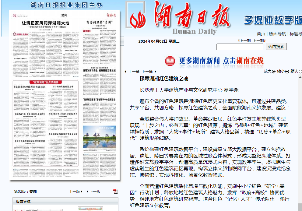 近日,我校建筑学院易学尧副教授在《湖南日报》2024年4月2日第2版“献策湖南”金点子栏目中发表了题为“探寻湖湘红色建筑之魂”的学术观点。易教授指出,湖南省内遍布众多红色建筑,这些建筑不仅是湖湘红色历史文化的重要载体,也是地方文化特色的体现。为了推进湖南文旅事业的全面发展,易教授提出了一系列具有针对性的措施与建议。