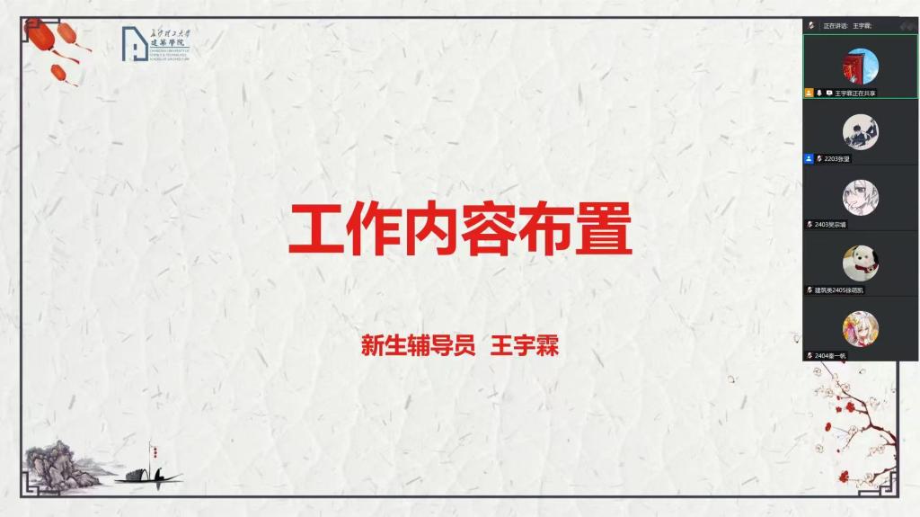 2025年8月24日下午,太阳成集团tyc122cc入口建筑学院组织召开线上新生志愿者培训会,全面部署迎新服务工作。会议由新生辅导员王宇霖老师主持,建筑学院党委副书记肖义慧,下班党员、下班干部及多位志愿者参与。