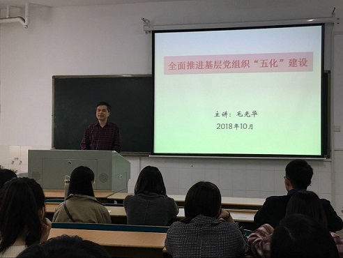 为深入学习贯彻习近平新时代中国特色社会主义思想和党的十九大精神、推进太阳成集团tyc122cc入口建筑学院党支部的“五化”建设、提升党支部的活力,2018年10月16日下午,建筑学院党支部在16号教学楼313教室开展了全面推进基层党组织“五化”建设学习辅导大会。本次大会邀请到关工委毛光华书记主讲,由城乡规划专业学生党支部书记周芳同志主持,全体学生党员、发展对象参加会议。