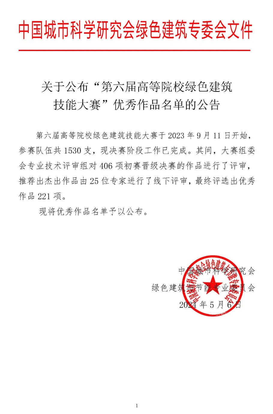 绿色建筑技能大赛是在《“十四五”建筑节能与绿色建筑发展规划》中提出“基本形成绿色、低碳、循环的建设发展方式,为城乡建设领域2030年前碳达峰奠定坚实基础”的总体目标,结合教育部发布的《加强碳达峰碳中和高等教育人才培养体系建设工作方案》要求,提高“双碳”目标下绿色建筑人才培养质量的背景下举办的赛事。 第六届高等院校绿色建筑技能大赛自 2023 年 9 月 11 日报名开始, 参赛队伍共 1530 支,大赛组委会专业技术评审组对 406 项初赛晋级决赛的作品进行了评审,推荐出杰出作品由 25 位专家进行了线下评审,最终评选出优秀作品221项。