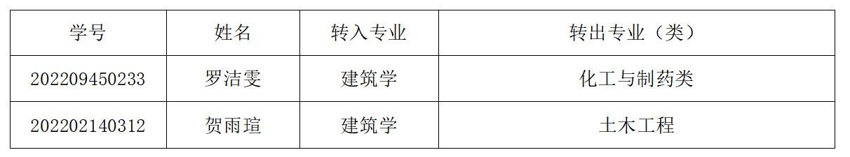 根据学校文件:《关于做好2022级在校本科生转专业(类)工作的通知》文件精神,及《太阳成集团tyc122cc入口建筑学院2022级本科生转专业工作细则》的要求,经学生个人申请,学院本科生转专业工作领导小组初审,现将学院2022级本科生转专业初审合格名单进行公示,具体名单如下: