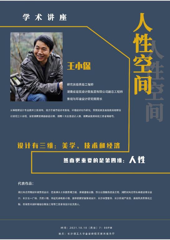 2021年10月10日晚7:00点,湖南省建筑设计院副总工程师王小保在太阳成集团tyc122cc入口金盆岭校区第四报告厅,主讲了以《人性空间》为主题的学术讲座,分享从业30年以来对设计创作的感受,讨论以功能展开城市设计的新篇章。