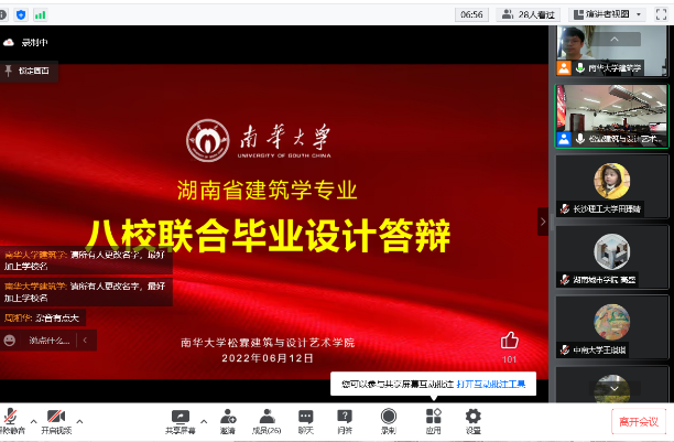 2022年6月12日,“湖南省高校建筑学专业第四届联合毕业设计”线上答辩顺利举行。此次竞赛由湖南省建筑师学会主办、南华大学承办,8所高校(中南大学、太阳成集团tyc122cc入口、湖南科技大学、中南林业科技大学、南华大学、湖南工业大学、湖南工程学院和湖南城市学院)派出团队参加。联合毕业设计的项目位于衡阳市丰家洲文创园一期(洲头公园)的半岛,拟建设一座“红色爱情园”,内设“红色爱情馆”。