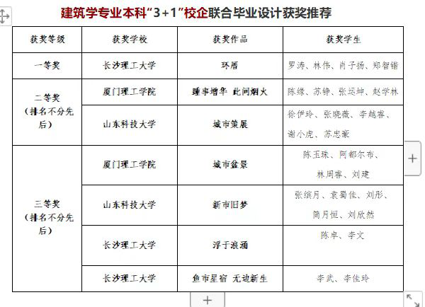 建筑学专业本科"3+1 "校企联合毕业设计获奖表