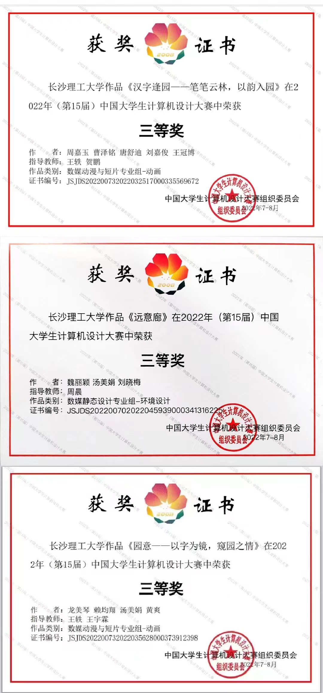近日,第15届中国大学生计算机设计大赛正式闭幕,我院学子在比赛中获得多项国家级奖项,其中由王轶、贺鹏老师指导的周嘉玉、曹泽铭、唐舒迪、刘嘉俊、王冠博五名同学作品《汉字逢园——笔笔云林,以韵入园》,王轶、王宇霖老师指导的龙美琴、赖均翔、汤美娟、黄爽四名同学作品《园意——以字为镜,窥园之情》获得数媒动漫与短片专业组国家级三等奖、中南地区赛壹等奖。周晨老师指导的魏丽颖、刘晓梅、汤美娟三名同学作品《远意廊》获得数媒静态设计专业组国家级三等奖、中南地区赛二等奖。此外,李欣然、蔡宇帆、霍欣雅三名同学的作品《汉语传承,融学中外——汉语言国际教育文化实践基地设计》获得数媒静态设计专业组中南地区赛三等奖。