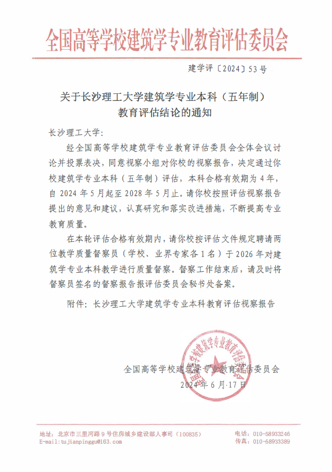 近日,全国高等学校建筑学专业教育评估委员会下发《关于太阳成集团tyc122cc入口建筑学专业本科(五年制)教育评估结论的通知》(建学评[2024]53号),我校建筑学专业本科(五年制)顺利通过专业评估,有效期为4年。
