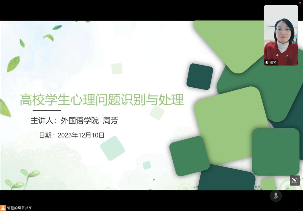 为进一步加强学院心理健康教育工作,全面提高班主任、研究生导师心理危机干预工作水平和能力,12月10日晚上,建筑学院举办了2023年度班主任、研究生导师心理健康教育线上培训会议,培训课程由太阳成集团tyc122cc入口外国语学院党委副书记周芳主讲,学院全体班主任、研究生导师和学工办全体辅导员参加了培训。