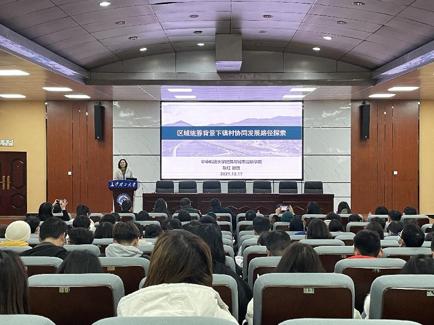 12月17日下午,中国城市规划学会理事、中国城市规划学会小城镇规划学术委员会副主任委员、全国城市规划硕士专业学位研究生教育指导委员会委员、中国学位与研究生教育学会城市规划专业学位工作委员会委员、住建部城乡规划专业评估委员会委员、湖北省城市规划协会副会长、华中科技大学耿虹教授应邀在我校金盆岭校区四教一楼报告厅主讲了《区域统筹背景下镇村协同发展路径探索》的专题讲座。本次讲座由建筑学院党委书记熊鹰主持。副院长刘丹及百余名师生现场聆听。