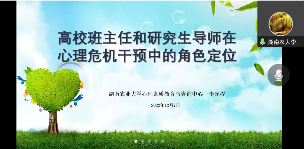 为进一步加强常态化疫情防控形势下心理健康教育工作,全面提高班主任、研究生导师心理危机干预工作水平和能力,12月7日晚,建筑学院和外语学院联合举办了2022年度班主任、研究生导师心理健康教育线上培训会议,培训课程由湖南农业大学心理素质教育与咨询中心专职老师李光程主讲,学院全体班主任、研究生导师和学工办全体辅导员参加了培训。