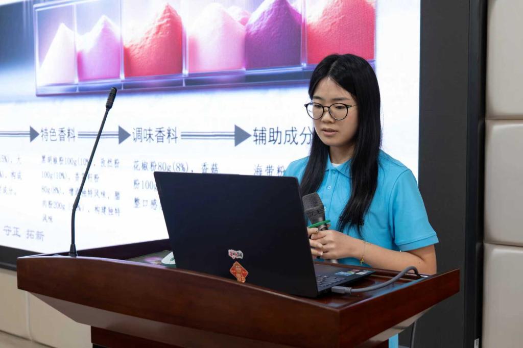 比赛伊始,侯雨菡宣读决赛纪律与评比规则。各参赛队代表依次登台,围绕产品设计理念、制作工艺、风味特点及营养价值进行详细汇报;面对评委的专业提问,队员们沉着应答,充分展现出扎实的专业基础与良好的应变能力,现场交流氛围热烈,思维碰撞频繁。