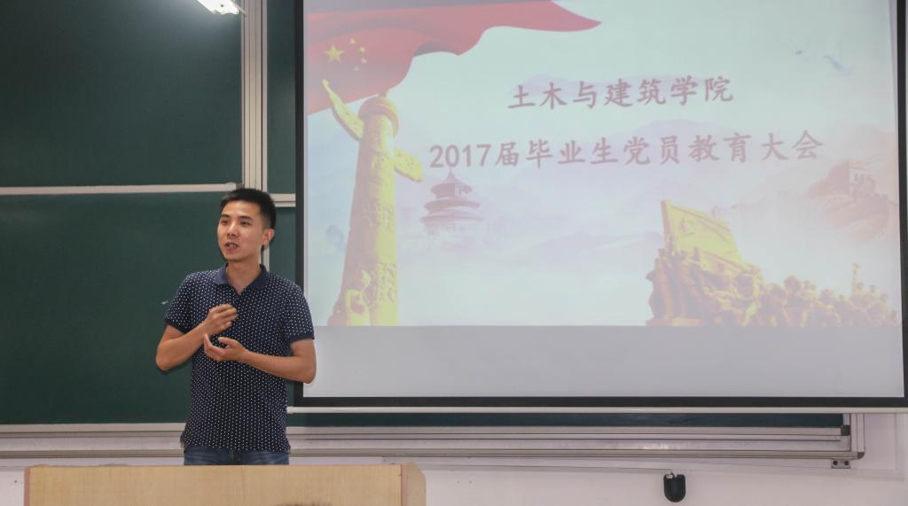 6月15日下午,土建学院在工一A212召开全体毕业生党员教育大会,会议由院党委副书记王煜坤主持,院党委书记张可荣、党建辅导员龙承运、年级辅导员孙佳乐及全体毕业生党员参加。