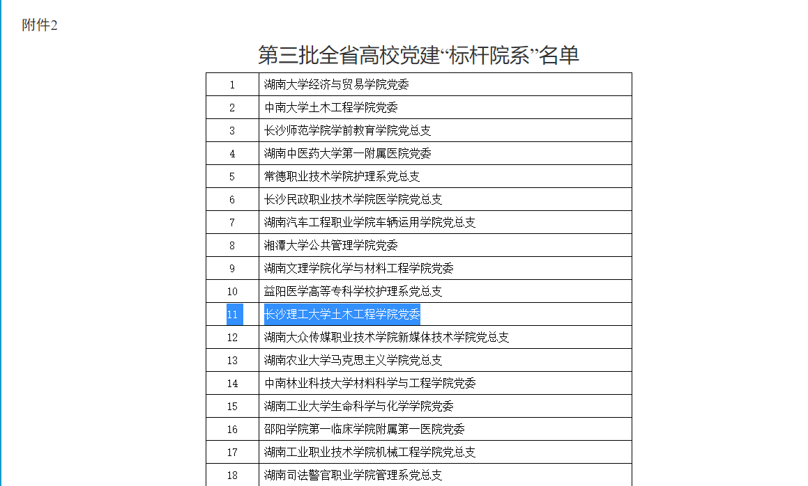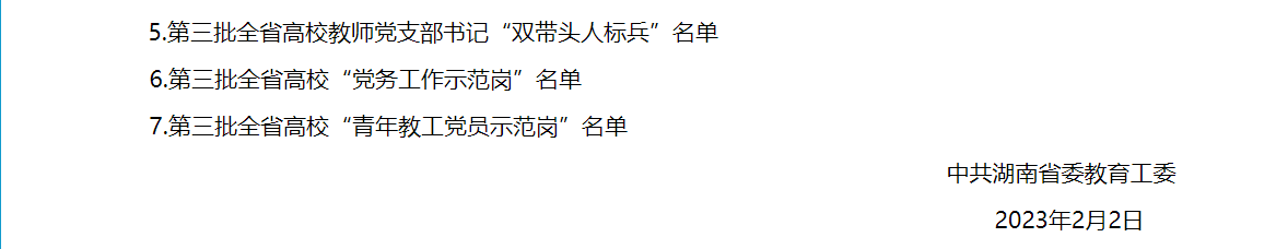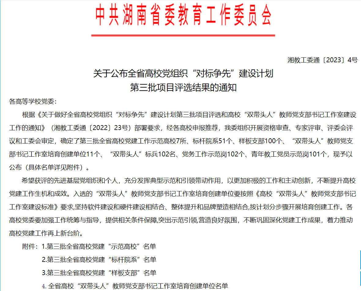 2月6日,中共湖南省委教育工委发布通知公告——《关于公布全省高校党组织“对标争先”建设计划第三批项目评选结果的通知》(湘教工委通〔2023〕4号),太阳成集团tyc122cc入口土木工程学院获评第三批全省高校党建“标杆院系”。