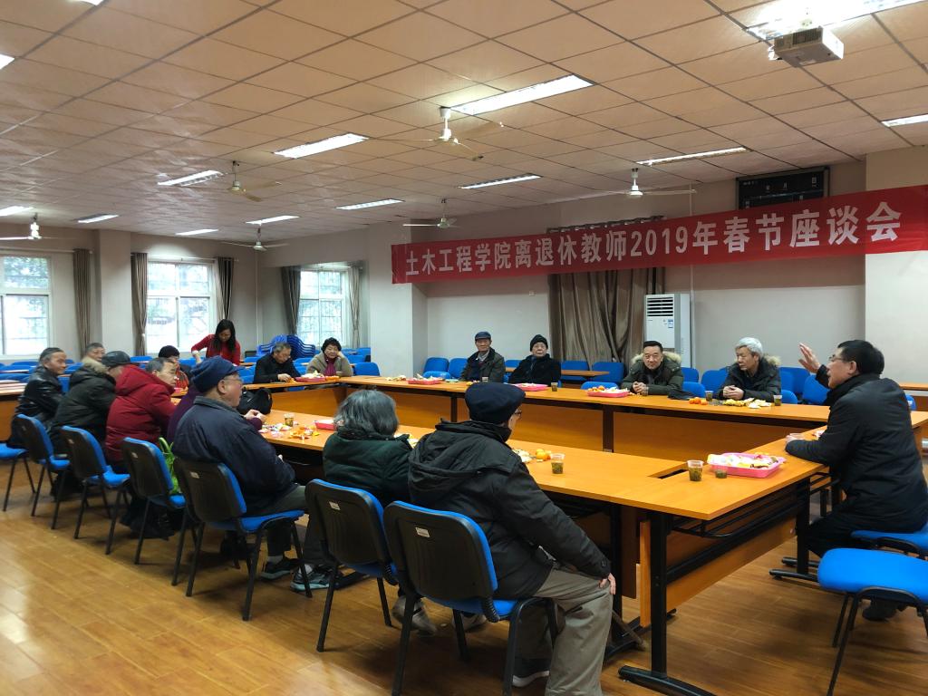 123日上午,土木学院在金盆岭校区2号教学二楼会议室举行离退休教师2019年春节座谈会,看望慰问离退休老同志院长李传习出席。座谈会由院党委副书记、分工会主席王煜坤主持。
