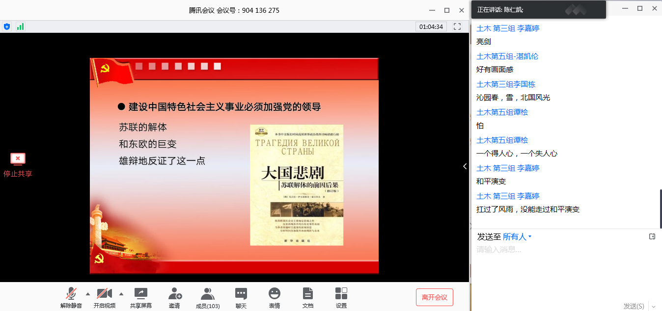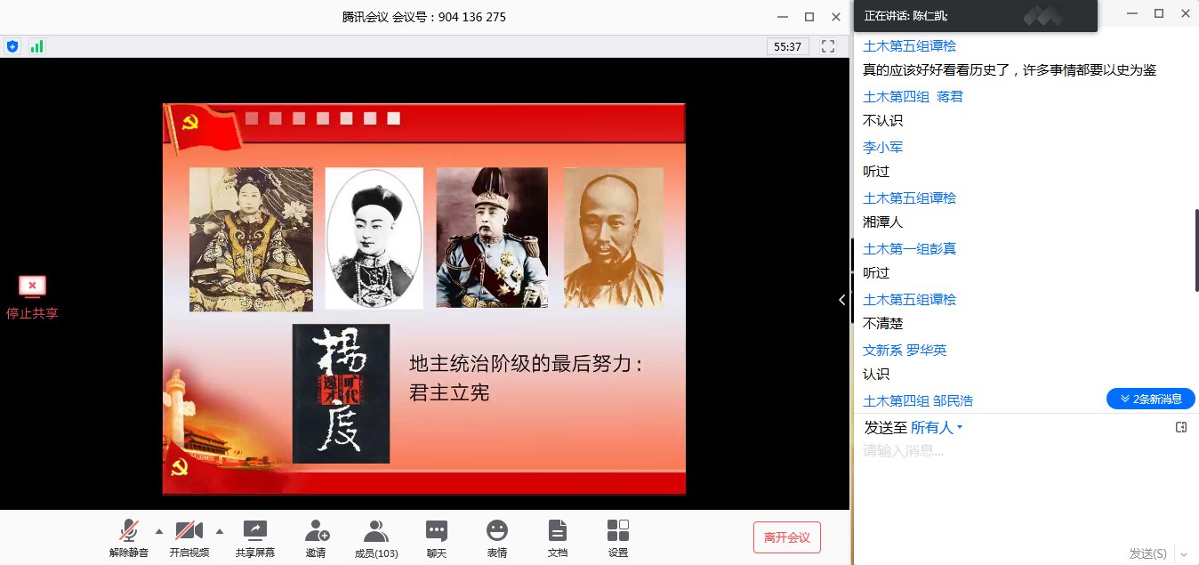 陈仁凯谈到,党的宗旨是“全心全意为人民服务”,其中“全心全意”的内涵即中国共产党不偏心于任何特定阶级,自始至终只代表人民的根本利益。随后,他介绍了党的指导思想的具体内容,并详细叙述将其作为指导思想的原因,强调中国特色社会主义理论体系是一脉相承、与时俱进的。